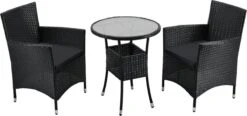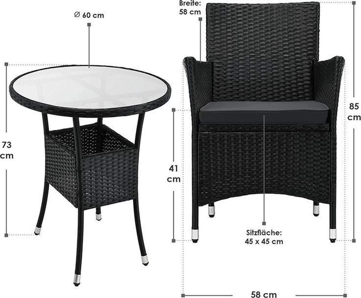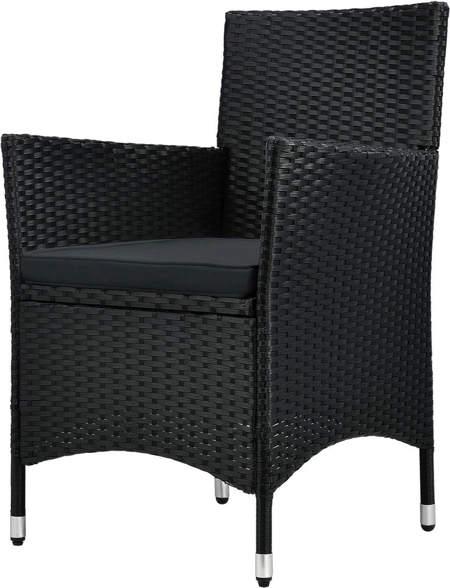 Met het materiaal polyrotan ben je helemaal on trend. Het hoogwaardige gevlochten materiaal wordt steeds populairder en overtuigt met tal van positieve eigenschappen. De synthetische vezel trotseert weer en wind en is ideaal voor gebruik op je terras of in de tuin. De unieke rotan-look in zwart met grijze kussens geeft je nieuwe loungemeubel een moderne charme. Geniet van warme zomeravonden in ontspannen samenzijn met een glas rode wijn op je balkon.
