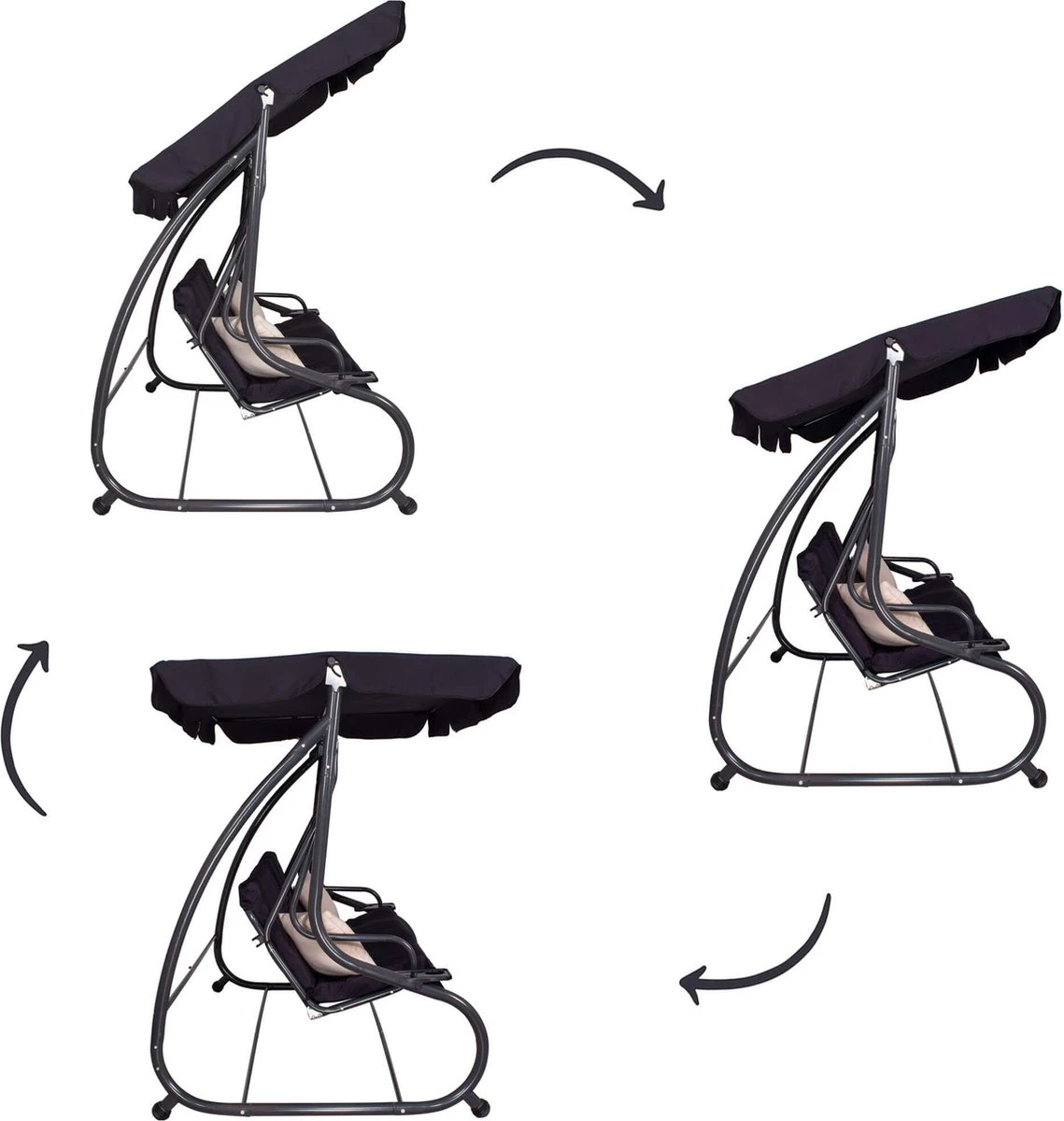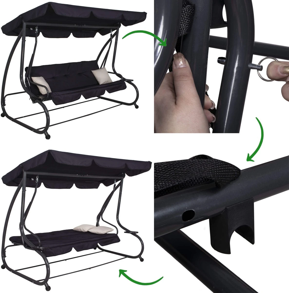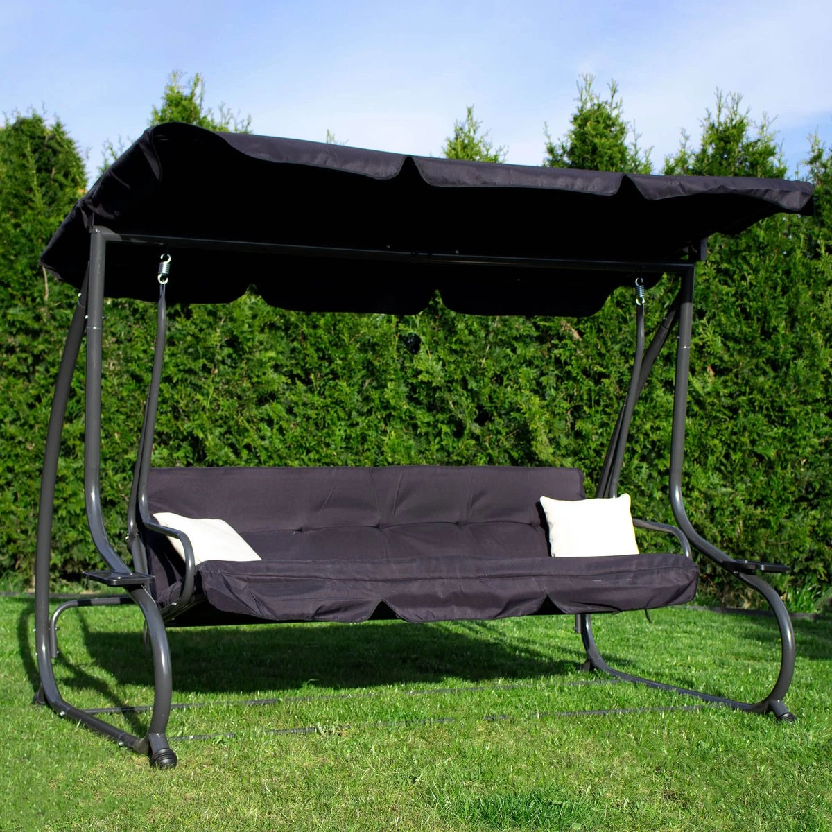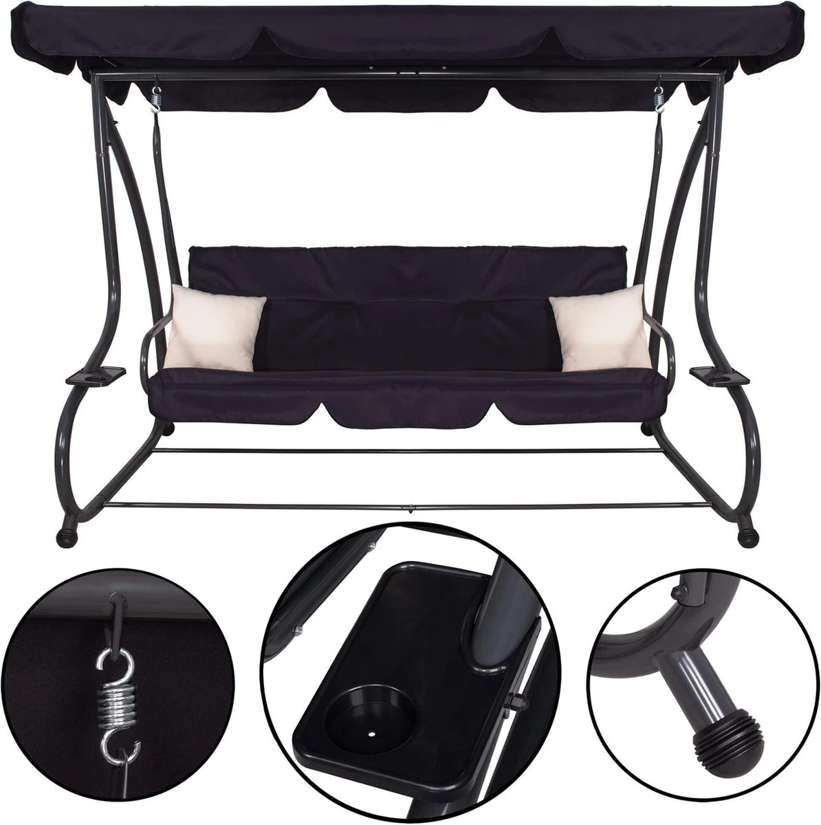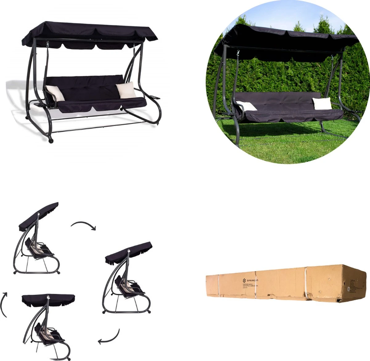 Springos Schommelbank | Linda-Schommel | 3-zits | Waterafstotend | Inclusief 2 Kussens | Verstelbare Luifel | 162 X 200 X 120 Cm | Zwart