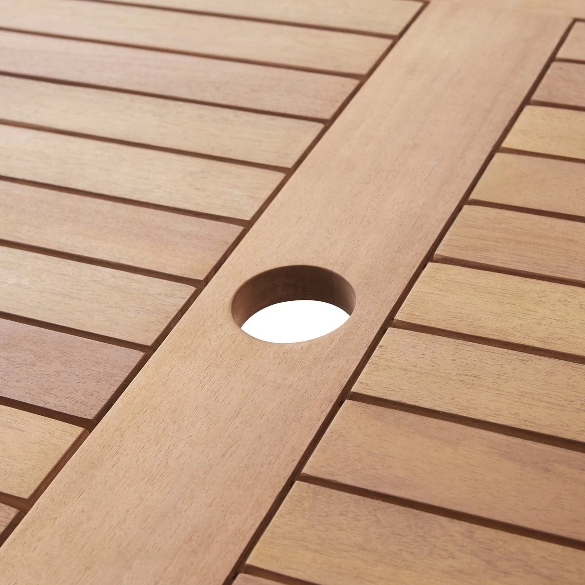 - ONTWERP: Het speciale en doordachte ontwerp van het lattenblad voorkomt ophoping van regenwater, het houten blad geeft je ook een elegante touch. Dikte tafelblad 4,5 cm.